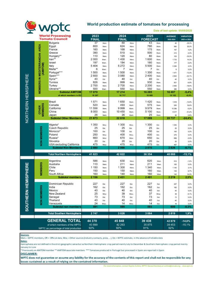 Due to weather problems like cold temperatures which are below averages this season, a reduction of about 14% in the tomato crop compared to 2024 season or 7% below the previous numbers for the current season is expected. The revised forecast for 2025 is thus 1.42 million tonnes.